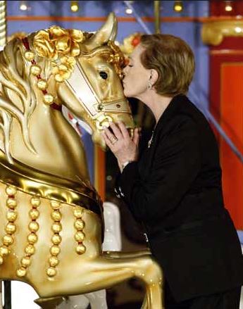 In celebration of the 50th anniversary of Disneyland in 2005, Julie Andrews was named Ambassador of The Happiest Homecoming on Earth. In a move bringing her Disney career full circle, Andrews was able to select her favorite horse from King Arthur’s Carousel, which was then given the royal treatment for the Golden Anniversary. She selected Jingles, who was then given a golden coat of paint and doled out in jewels. Following the anniversary celebration, Jingles was then decorated to match the carousel horse she rode in Mary Poppins.