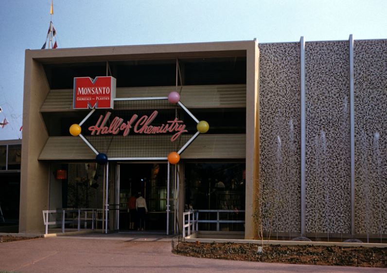Star Tours stands near the entrance of Tomorrowland, near the Plaza Inn on Main Street.  Being located near the front of the park, it is a piece of property that has been occupied since Disneyland park opened in 1955.  First filling this space came the Disneyland Original, the Hall of Chemistry.  From Opening Day, the Hall of Chemistry, present by Monsanto spent 11 years teaching park guests about the wonders of chemistry through textual displays and oversized graphics and electrified wall displays.  The big selling point of this exhibit was synthetic carpet, as Monsanto claimed “capret makes it home.” Ah, science.