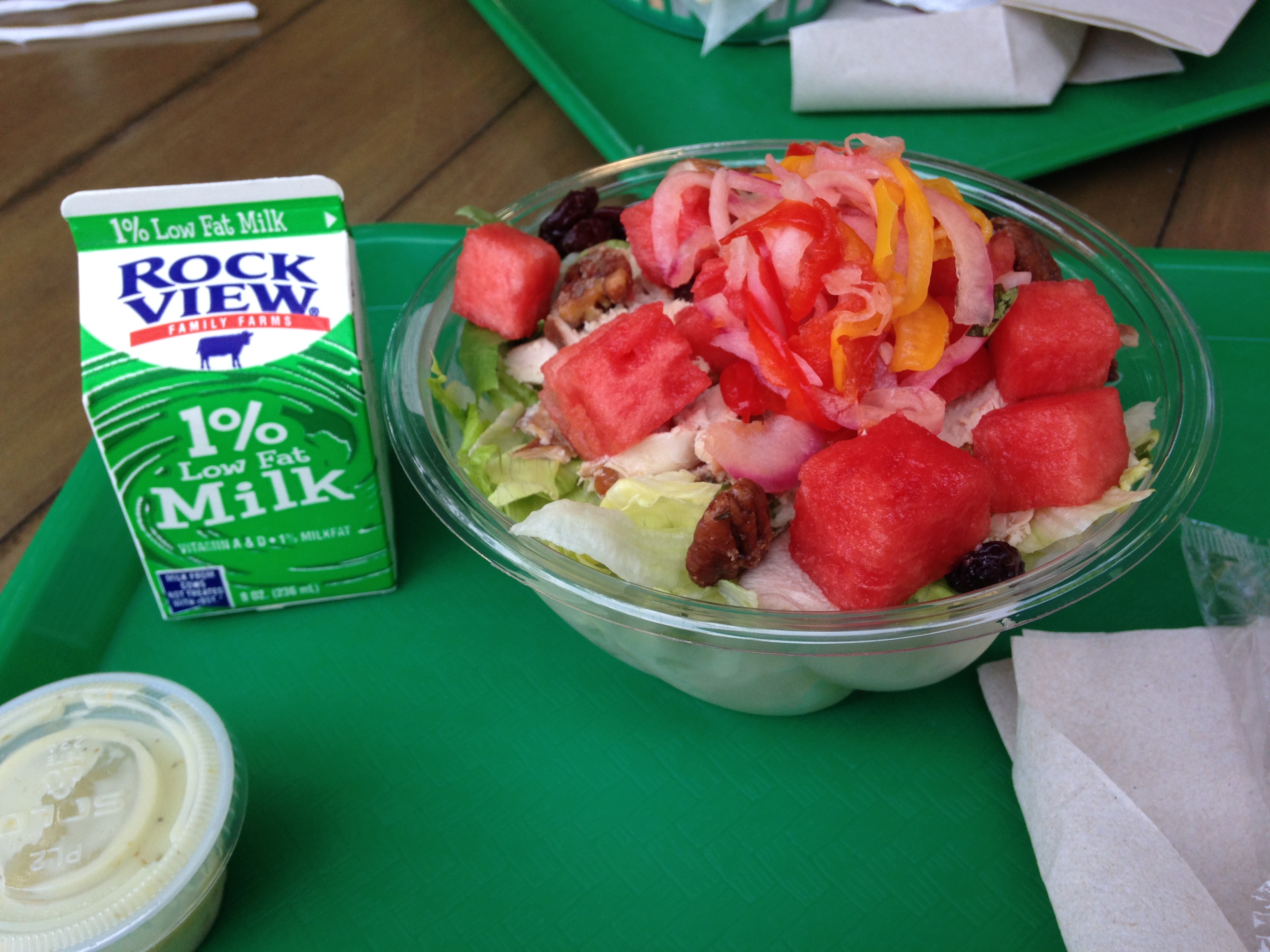 Again, it was a hot day, and the heat was really starting to be felt, so I decided to go the cool and refreshing route instead of the standard burger and onion rings that I would normally get. I ordered Big Al’s Chicken Salad, which was described as “smoked chicken on top of romaine and iceberg lettuce with watermelon, candied pecans, dried cherries, pickled red onions and honey-lime vinaigrette.” I can hear the questions now. Watermelon and onion? Cherries?? Honestly? This was one of the best salads I’ve had, inside or outside of parks (I do have salad from time to time). And it was a very generous portion and quite filling. Instead of doing the wise thing and spending an extra dollar with my lunch for a bottle of water, I chose to drink a milk with my meal. The milk penalized me another $1.79 (plus tax) for my water bottle blunder, and the meal cost me $12.18 overall.