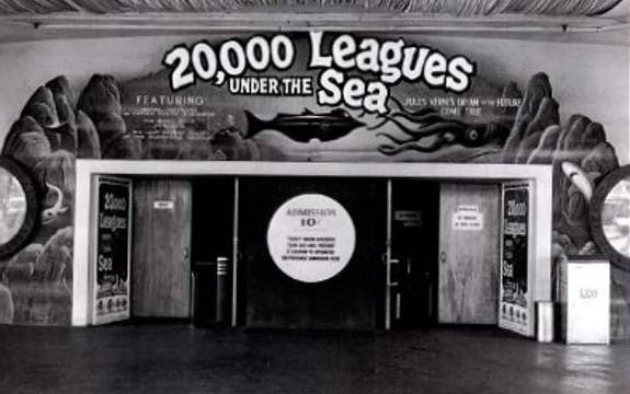 Next in the chronological tour of Tomorrowland comes the August 3, 1955 opening of the 20,000 Leagues Under the Sea Exhibit. One of the last attractions to be thought of for Opening Day, the movie-inspired exhibit was not ready for opening day, and for several weeks later. Instead of looking towards the future, the foremost stage building of Tomorrowland contained the giant squid and other items from the still popular 1954 movie starting Kirk Douglas. When it opened, it offered park guests a first time view of movie props. While the intended temporary attraction lasted for 11 years, Captain Nemo’s pipe organ lives on at the Haunted Mansion.