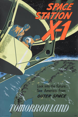To the left of the Clock of the World stood one of the main show buildings of Tomorrowland, containing Space Station X-1, also known as a Satellite View of the World. This was more painting than attraction, giving park guests the chance to stand on a platform and look down on the earth from “90 miles above.” A three minute presentation took place, with the room rotating around the map. This attraction took an A Ticket to experience it. The platform would last until 1960.