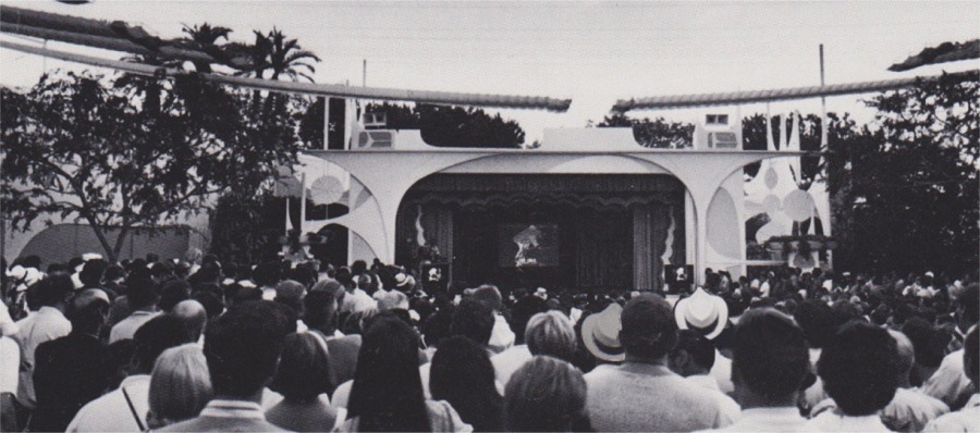 At opening day, the heart of Tomorrowland was the Court of Honor, which was a eight-point star-shaped flower box. Each of the points contained six flag poles, which flew one of the 48 state flags of the nation. Court of Honor would be short lived in its opening day location, as it would be relocated and renamed in 1956.