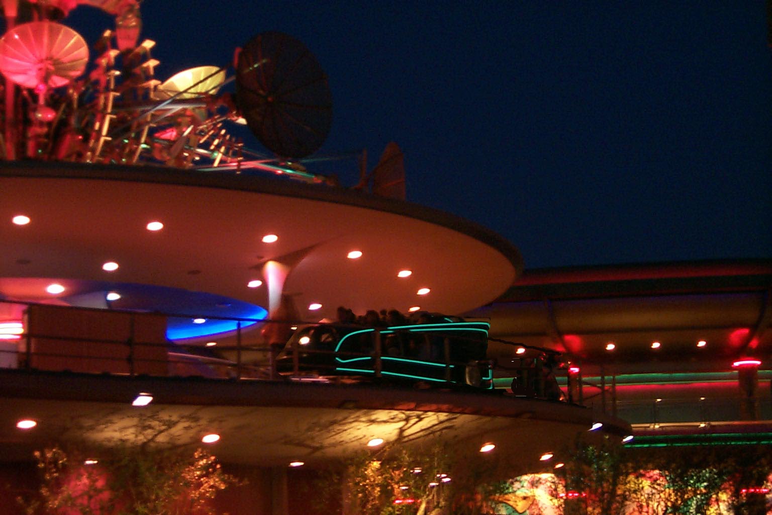 With the Astro-Orbitors landing at the Tomorrowland entrance, there was need for a focal point at the top of the Rocket Rod loading platform. Borrowing a design from Disneyland Paris, the Observatron. This kinetic sculpture resembles a collection of satellite dishes and cables. One feature often overlooked is the Observatron also acts as a clock, going into motion each quarter hour and displaying the time at the end of its activity, similar to the clock tower of It’s A Small World in Fantasyland. The Observatron still stands today.