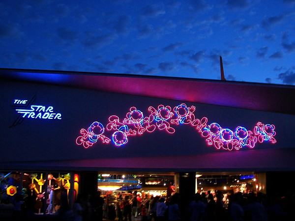 With a space Captain behind it, and another space attraction being built adjacent to it, the Character Shop was suddenly in need of a makeover. The doors shut on September 15, 1986, and it was reopened on November 21, 1986 as the Star Trader. Guests were greeted to the 5000 square foot retail shop with a neon-lit Mickey Mouse floating through space. Inside, toys, plush, shirts and hats were available for purchase, and a 30 foot X-Wing fighter hung overhead, giving a foreshadow of what was coming to the park in just six weeks. In preparation of the Star Wars attraction, toys and collector models were also available on opening day; now guests are able to build their own light saber. The store is still in operation, and quite popular, today.