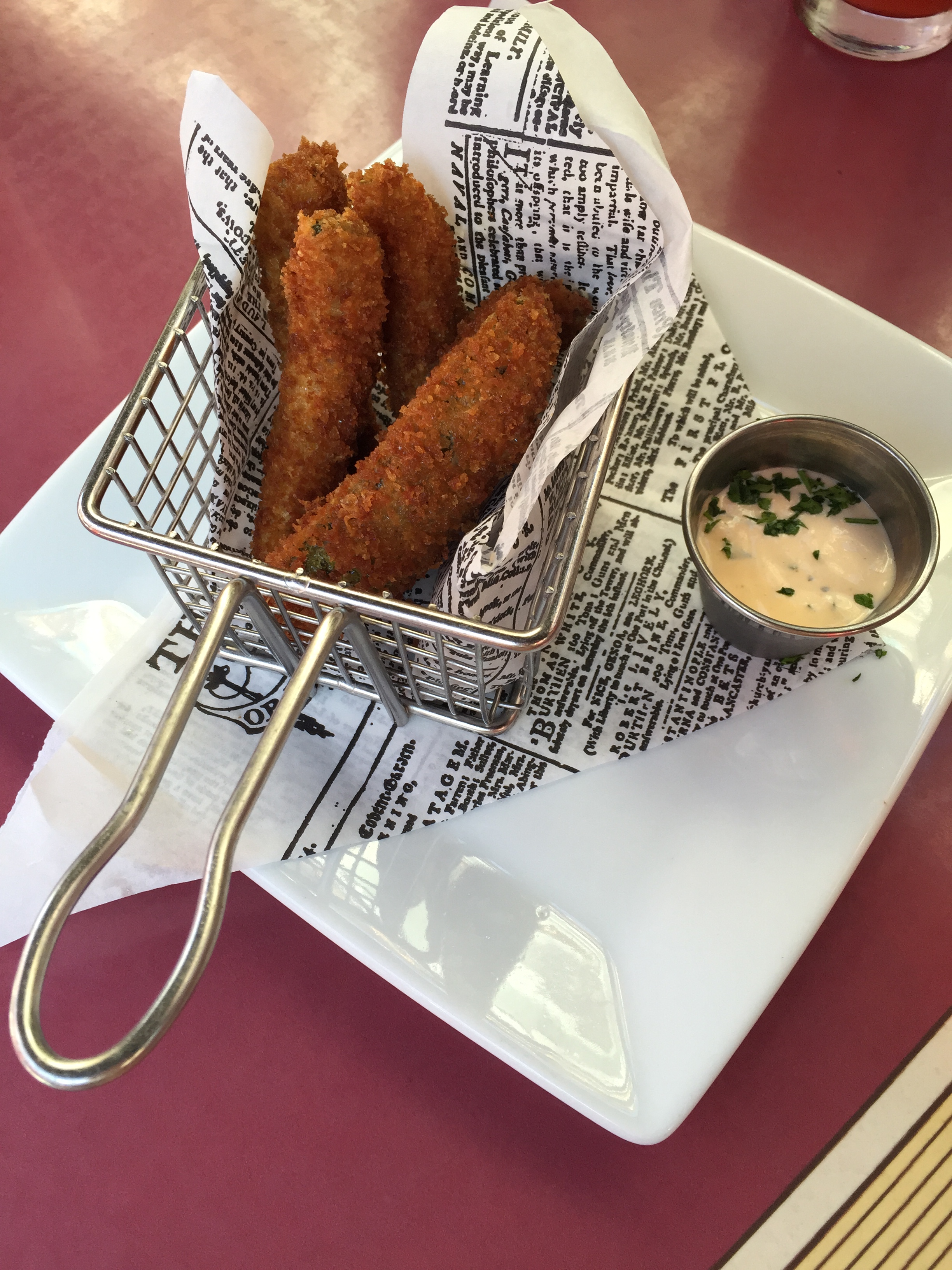 Onto the food. Michelle and I had both asked on different forums what foods would be the best to try at Carnation Cafe. The overwhelming winner left us both underwhelmed at first mention: Fried Pickles. Tommy was not interested in sampling any, so Michelle and I decided to share an order of 5 spears. These pickles were coated in Parmesan cheese and panko bread crust and were served with a dipping sauce. The spears were surprisingly crunchy after being deep fried and were not too tart, despite being dill pickles (I prefer sweet). If I end up eating at Carnation Cafe again, I will splurge for $6.49 to get these again.