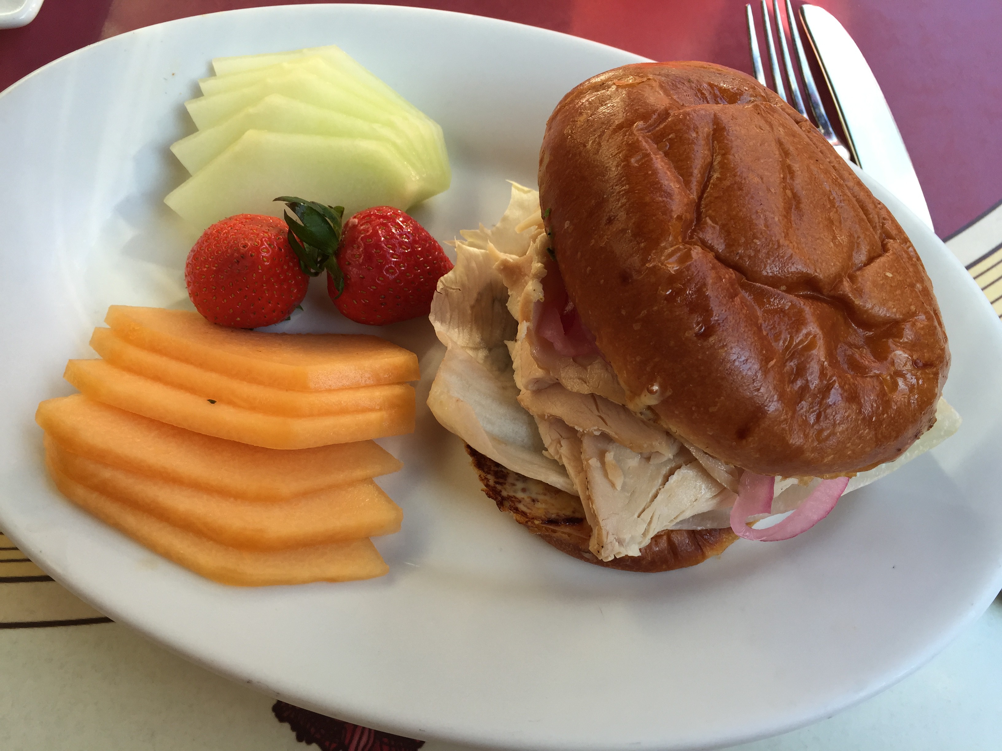 For my entree, I ventured off menu slightly. As it was still warm outside, I decided to get the roasted turkey sandwich instead of a hot meal. The menu version of the sandwich was listed on potato bread, but I switched out to a brioche bun, as that is just my bread preference. Instead of french fries, I asked for a side of fresh fruit, which consisted of some honeydew melon, cantaloupe, and a strawberry. This was…a sandwich. While it was tasty and filling, the company made the meal much more than the meal made the meal. But hey, it’s a turkey sandwich.