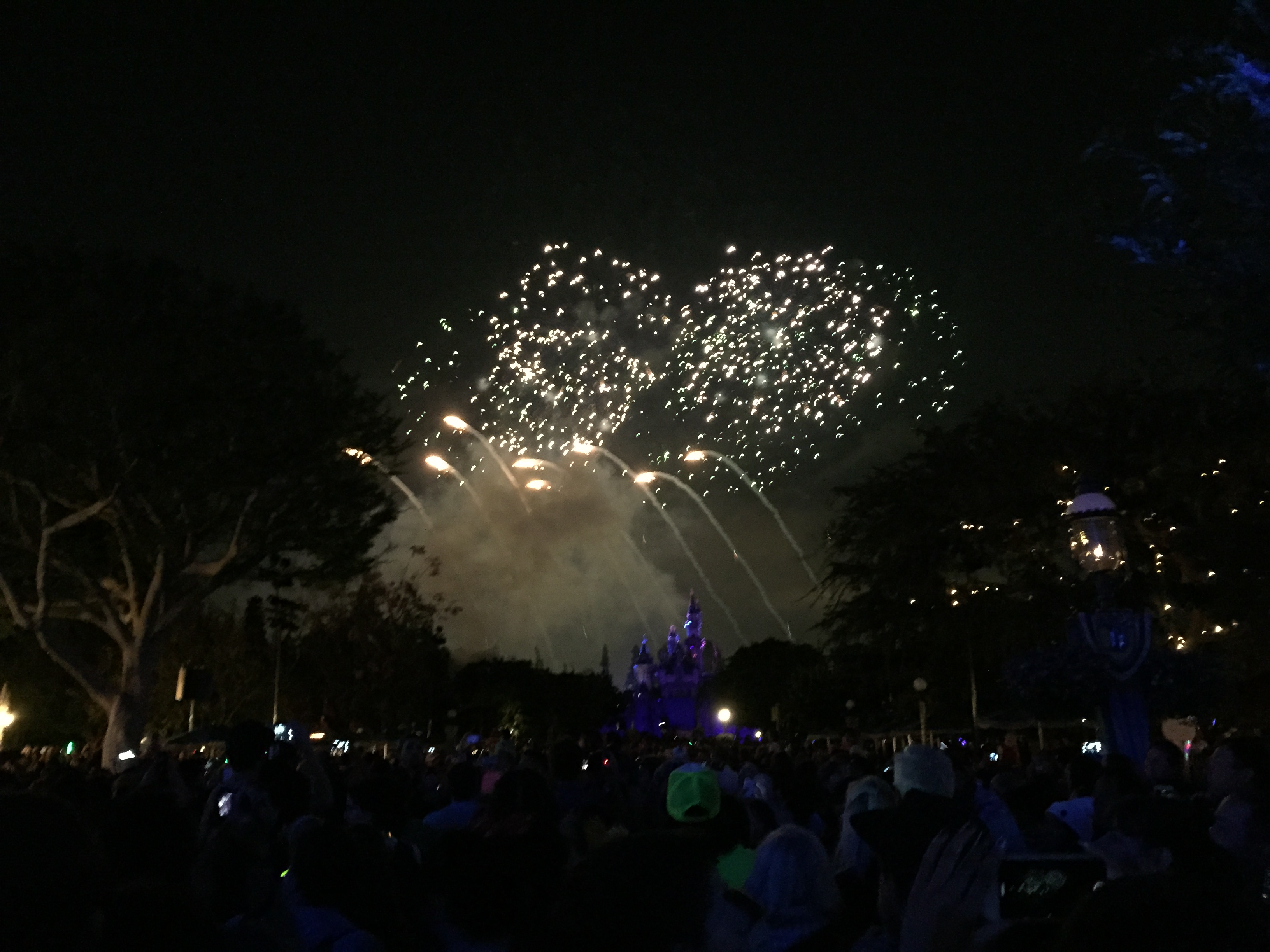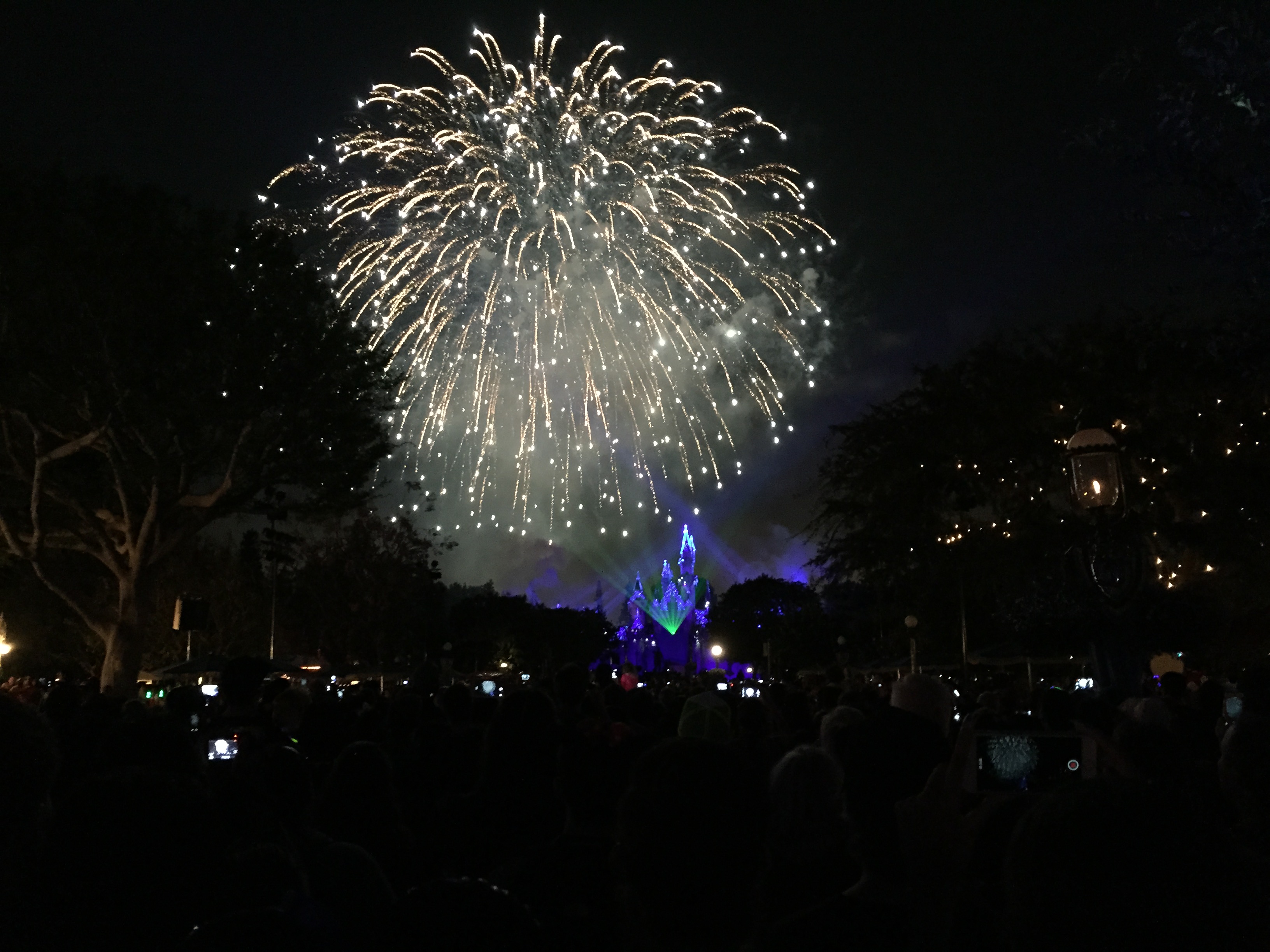 As soon as Sorcerer Mickey had passed by, we were allowed to gather in Main Street to wait to the fireworks, which would only be a few more minutes. We were in the middle of the street, still in front of Coke Corner and the Main Street Photo Supply Co., which offered a view of the Main Street building projections along with a view of Sleeping Beauty Castle; provided you could see over the top of everyone’s head (sorry, Michelle). Where you are standing is important for the fireworks, as there are projections shown on park landmarks to match the score of the show, including the facade of It’s A Small World and Matterhorn Mountain. I need to make another trip down to enjoy these projections, but the vantage point I had was a very good one. The projections on the Main Street buildings stole the show for me, especially during the Mary Poppins sequence, and I will admit that while I was able to take many photos of the fireworks themselves, I missed most of them live, as I was turning my head left and right to see the buildings instead. Again, another trip is needed.